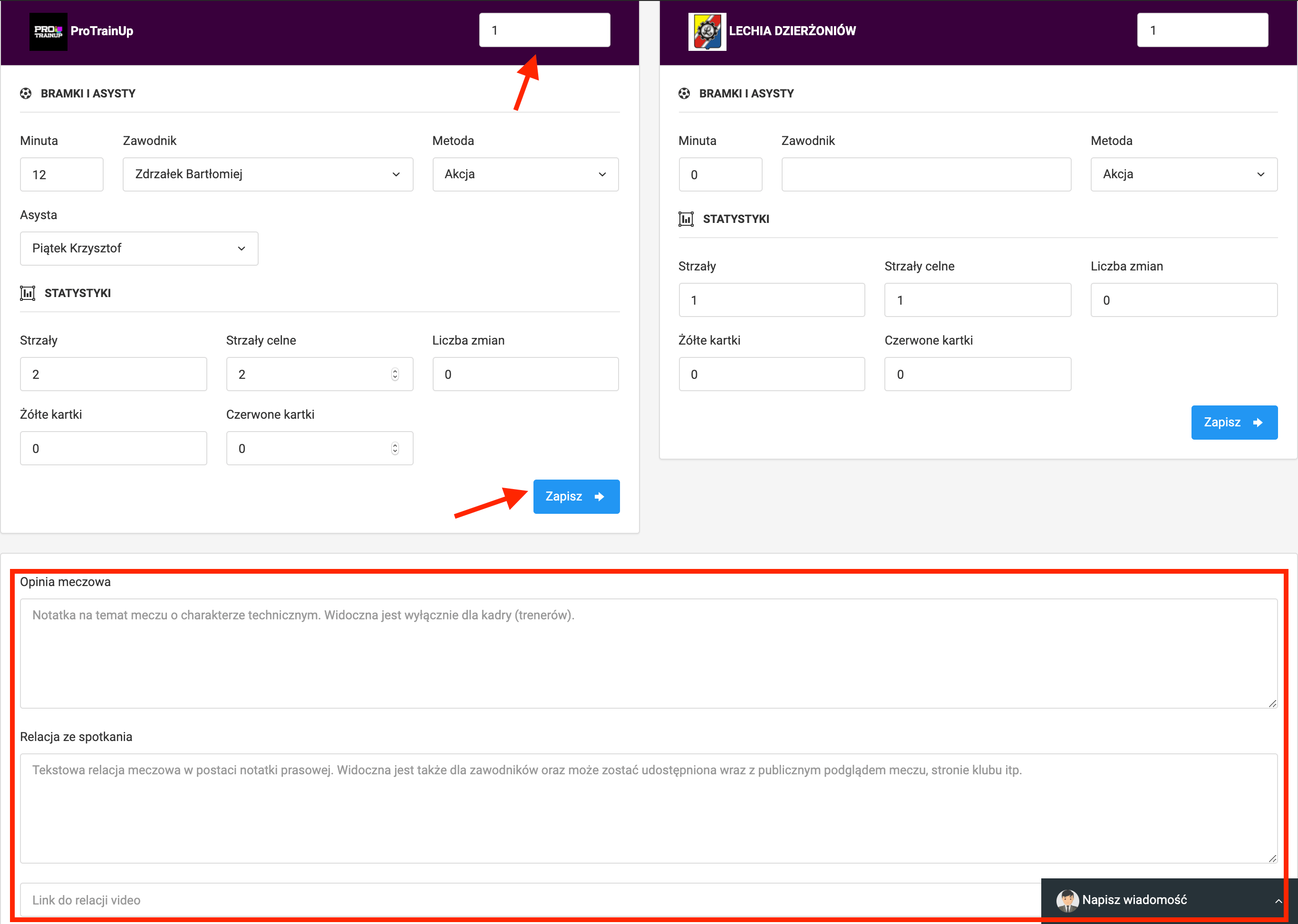 Zaawansowany widok pozwala, na wprowadzanie szerokich statystyk dotyczących danego meczu. W tym oknie, w zależności od wybranej dyscypliny sportu, możesz wprowadzać informacje o: golach, punktach, asystach, strzałach, zmianach, karach, a także o sposobach zdobycia bramek. Pamiętaj o każdorazowym zapisywaniu formularza. Zapisanie danych ilościowych pozwoli Ci dodać również dane jakościowe jak np. strzelcy bramek, asystujący, itd. Poniżej formularza znajdziesz trzy pola tekstowe: opinia meczowa, relacja ze spotkania oraz miejsce na link do materiału wideo.